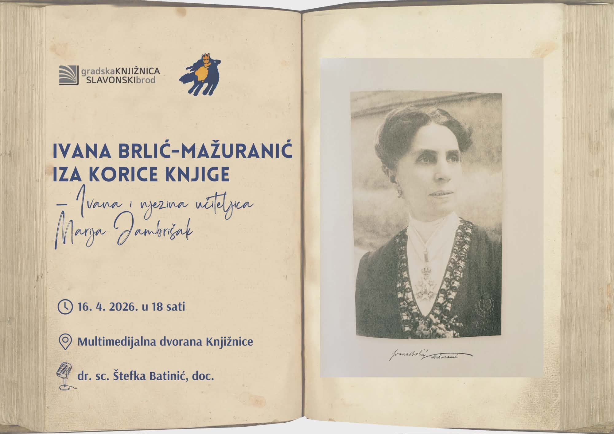 Predavanje pod nazivom Ivana Brlić-Mažuranić iza korice knjige – Ivana i njezina učiteljica Marija Jambrišak održat će se 16. travnja 2026. u Multimedijalnoj dvorani knjižnice, s početkom u 18 sati.