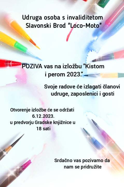 U sklopu obilježavanja Međunarodnog dana osoba s invaliditetom Udruga osoba s invaliditetom Slavonski Brod “Loco-Moto” po osmi puta organizira izložbu slika: “Kistom i perom Loco-Moto” 2023. Otvorenje izložbe održat će se u srijedu, 6. prosnca 2023. s početkom u 18.00 sati u predulazu Gradske knjižnice Slavonski Brod.