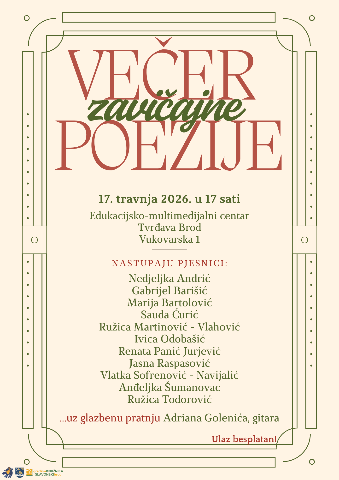 U petak, 17. travnja 2026. u 17 sati, u Edukacijsko-multimedijalnom centru Tvrđava Brod, očekuje vas susret s brojnim pjesnicima i bogat program uz glazbenu pratnju.