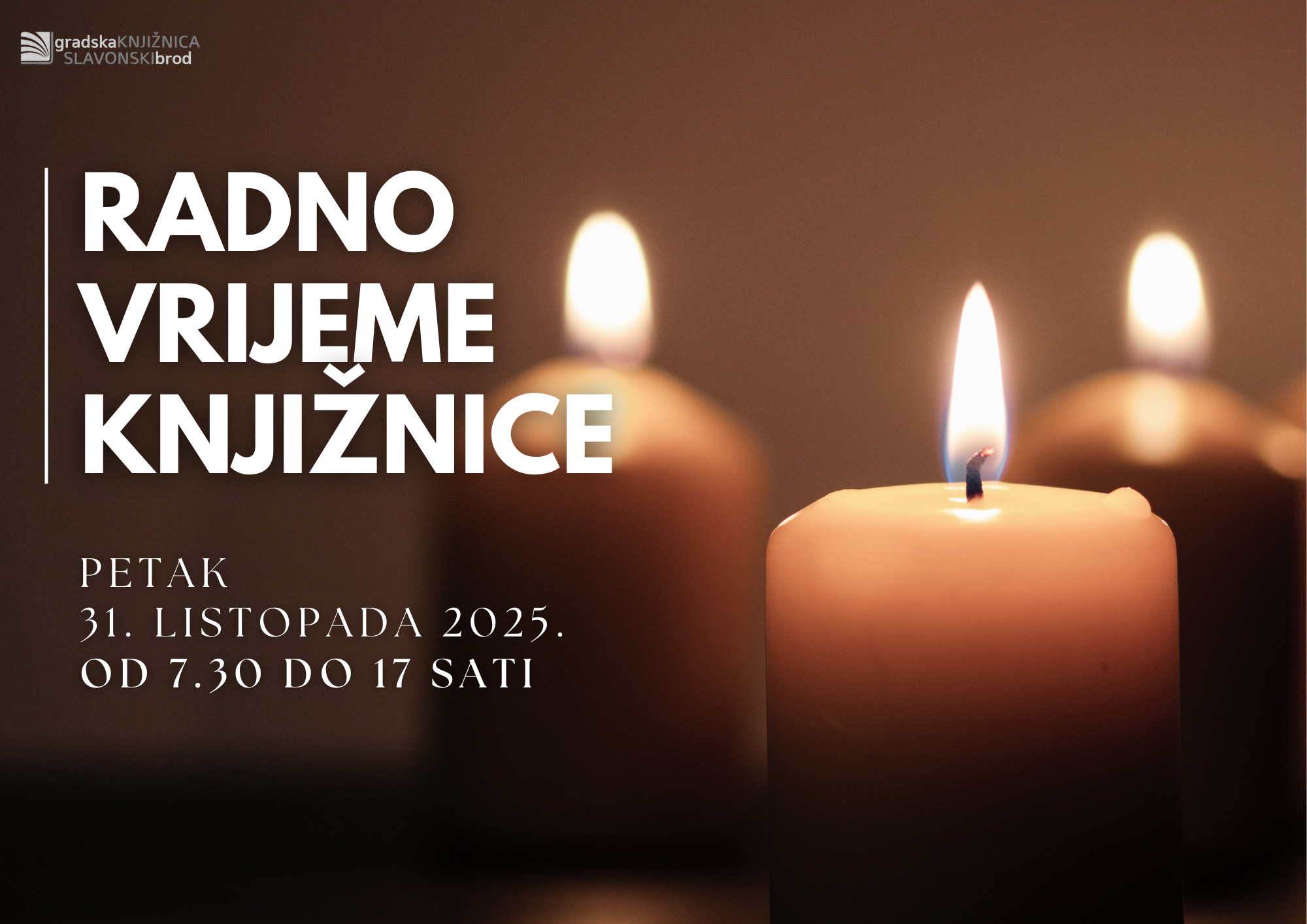 Pred dolazak blagdana koji nas podsjeća na naše voljene koji više nisu s nama, Knjižnica će imati prilagođeno radno vrijeme. 🕯 U petak, 31. listopada Knjižnica će biti otvorena od 7.30 do 17.00 sati.