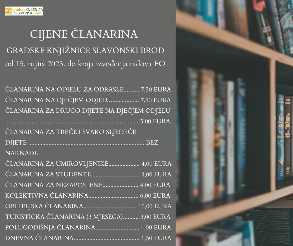 Također, od 15. rujna 2025. pa sve do završetka radova energetske obnove zgrade, CIJENE ČLANARINA u Knjižnici prilagođene su kako bismo vam i dalje omogućili što pristupačnije korištenje svih naših usluga.