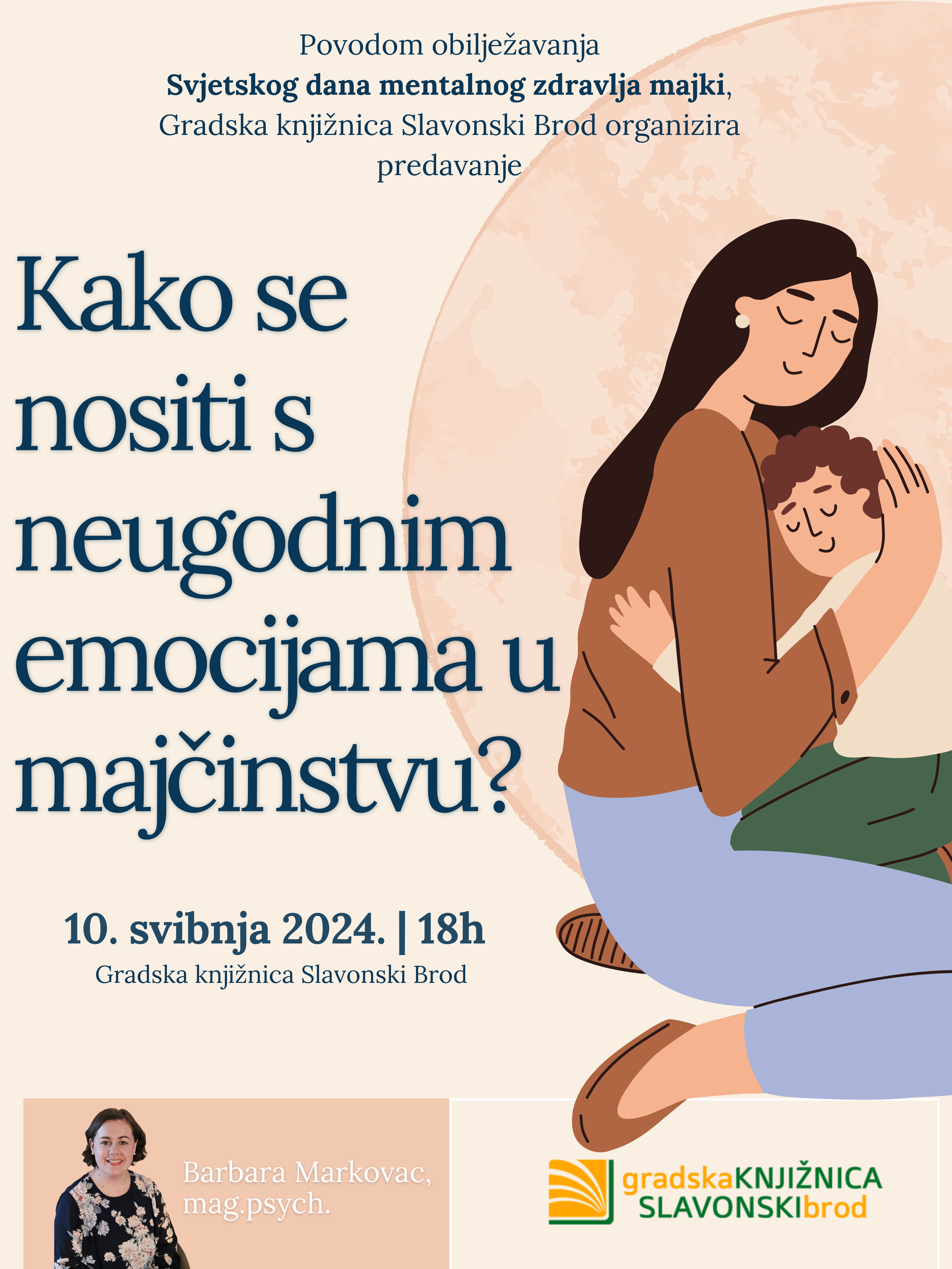 Povodom obilježavanja Svjetskog dana mentalnog zdravlja majki pozivamo vas na predavanje mag. psych. Barbare Markovac koja će govoriti o tome kako se nositi s neugodnim emocijama u majčinstvu. Predavanje će se održati u petak, 10. svibnja, s početkom u 18. 00 sati u Velikoj dvorani Knjižnice.