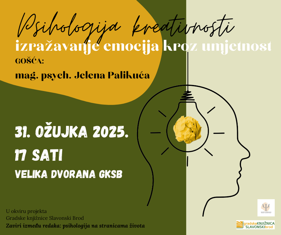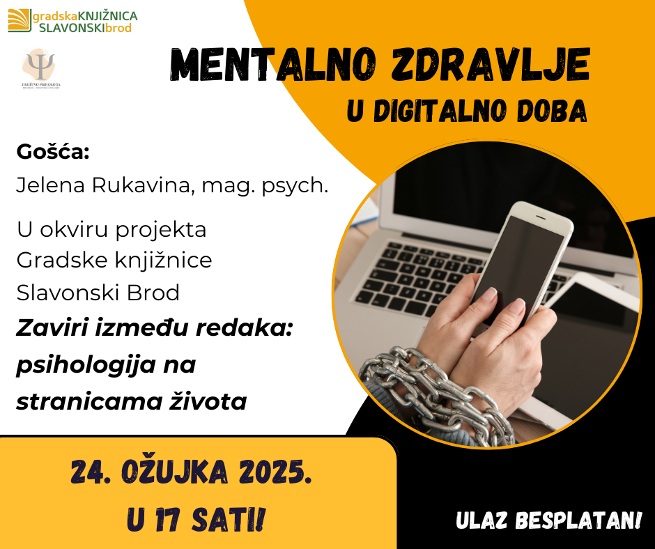 POZIV NA PREDAVANJE: MENTALNO ZDRAVLJE U DIGITALNO DOBA 📅 24. ožujka 2025. 🕔 u 17 sati📍 Gradska knjižnica Slavonski Brod🎤 Gošća: Jelena Rukavina, mag. psych. U današnje vrijeme, teško je zamisliti dan bez ekrana. 📱💻 No, kako digitalni svijet utječe na naše mentalno zdravlje? Jesmo li mi ti koji kontroliramo tehnologiju – ili ona kontrolira […]